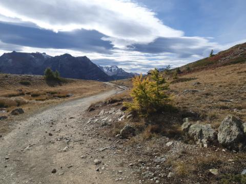La montée se fait à un rythme tranquille pour que tout le monde puisse suivre et nous avons le temps d’admirer les paysages alpins poudrés de neige à leurs sommets et les forêts de mélèzes qui commencent à jaunir à l’approche de l’hiver.